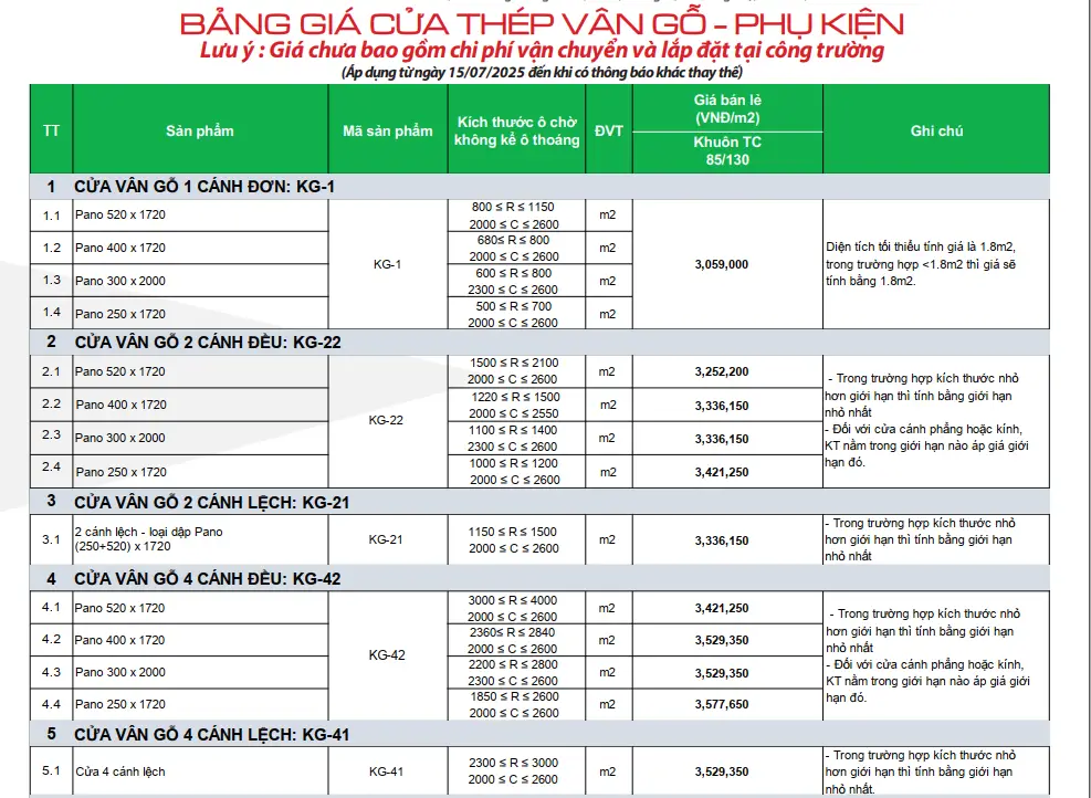 | Cửa thép vân gỗ 4 cánh lệch | 3000 x 2550 | 1 | 27.005.000 |