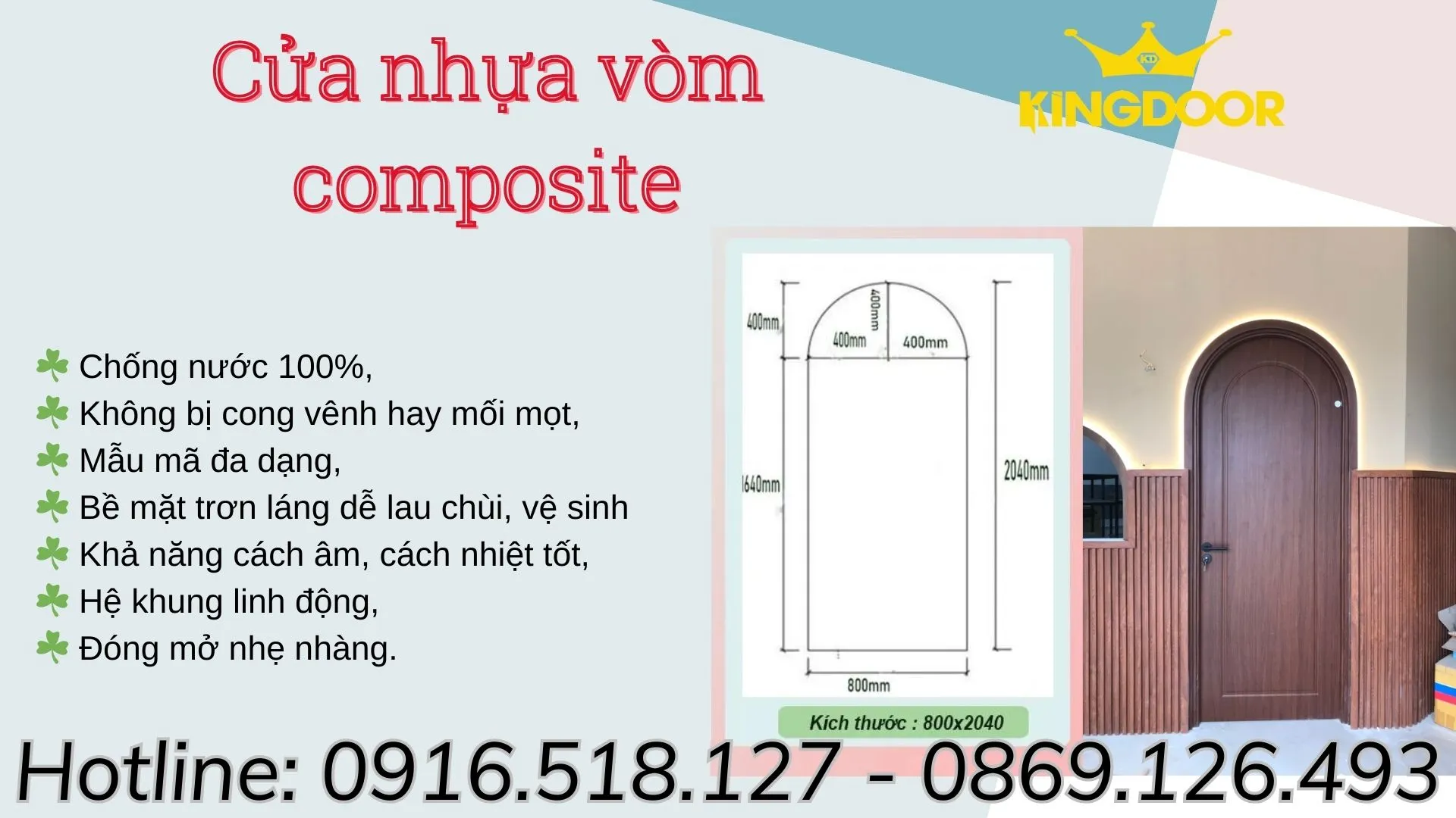| 1 | Cửa vòm nhựa gỗ composite sơn PU (SYA) (bao gồm cánh + khung bao), – Áp dụng tường dày từ 90mm-115mm – Kích thước chừa tường : 900×2200 – Khung bao , nẹp chỉ 2 mặt làm bằng nhựa gỗ – Độ dày cánh 40mm (± 2). – Được làm từ bột gỗ xay mịn với hạt nhựa và keo chuyên dụng dưới nhiệt độ và áp suất cao nên rất bền và cứng chắc. – Phủ da hoàn thiện. |